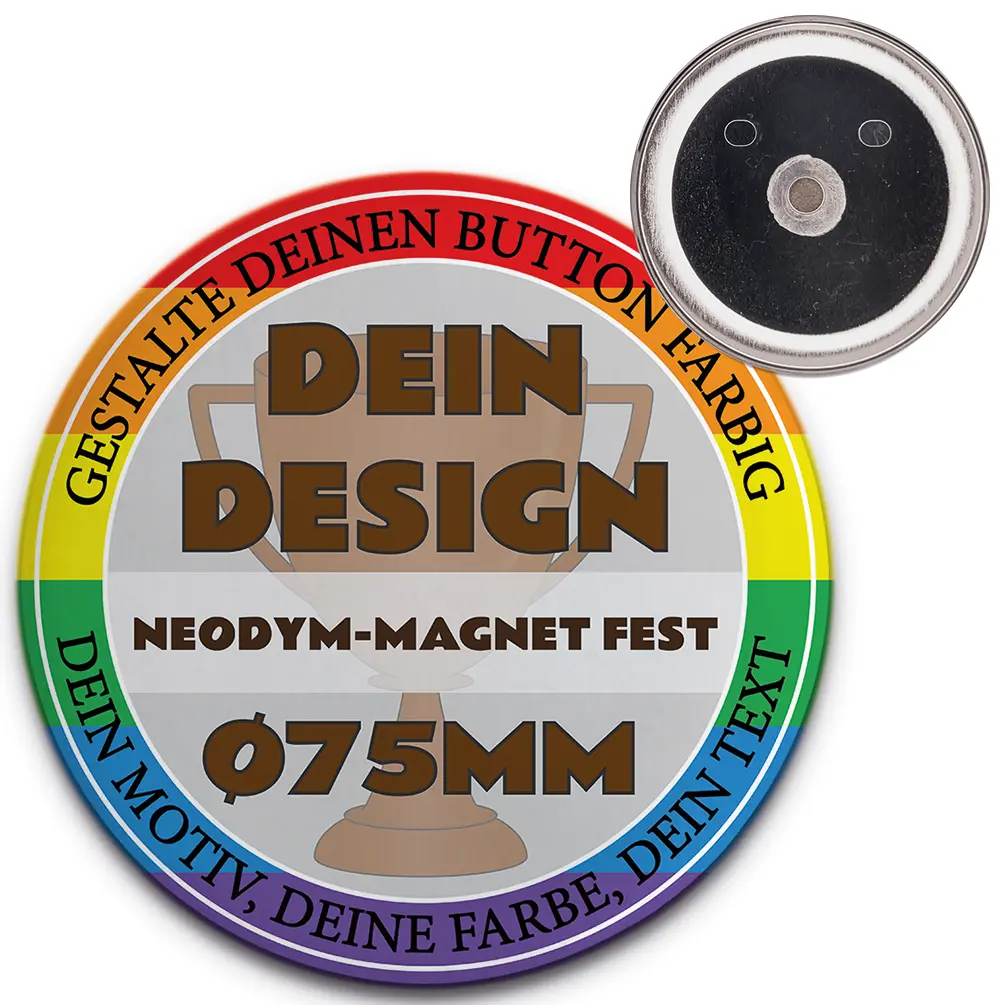 Der 75mm Button mit festem Neodym-Magnet & Umrandung ist die perfekte Wahl, wenn Du mit Deinem Design maximale Aufmerksamkeit erzielen möchtest. Diese beeindruckende Buttongröße bietet reichlich Platz für großflächige Fotos, auffällige Ankündigungen oder kreative Designs, die garantiert ins Auge stechen. Ob für Events, Marketingkampagnen oder persönliche Botschaften – der 75mm Button steht für Stil und Präsenz und eignet sich hervorragend, um Deine Ideen in Szene zu setzen. Die individuell gestaltbare Umrandung ermöglicht Dir zusätzliche kreative Freiheiten und verleiht dem Button eine professionelle Note.